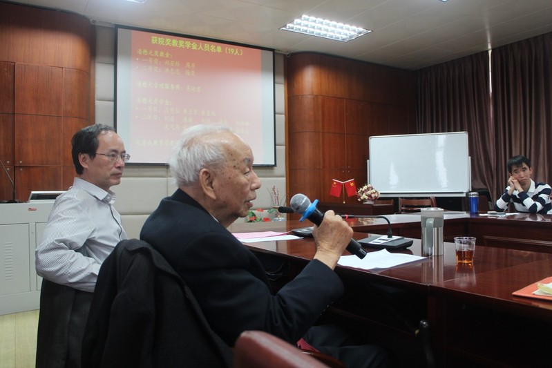 随后进行的是激动人心的颁奖仪式。颁奖前,由潘懋元先生和郑冰冰书记专门解释了“懋元奖”与“阮康成奖”设立的由来和发展情况的意义所在。紧接着刘海峰院长宣读了奖教奖学金的获奖名单,并为获奖的师生表示由衷的祝贺。最后潘懋元先生依次为获得院奖的师生颁发证书,并与获奖师生合影留恋,他亲切地鼓励大家继续发扬自强不息、勇于拼搏的革命精神。