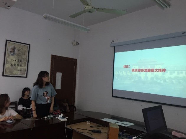 团支部委员张娟主持了本次活动。她首先介绍了陈嘉庚先生倾资办学、振兴中华的伟大贡献,讲述了罗扬才烈士英勇就义的革命事迹,然后通过分享《厦门大学校史纪录片之一——长汀之行》、原创话剧《哥德巴赫猜想》等视频让同学们更加直观深刻地感受“四种精神”。最后的讨论环节“谈谈你身边的厦大精神”引发了大家的热议。