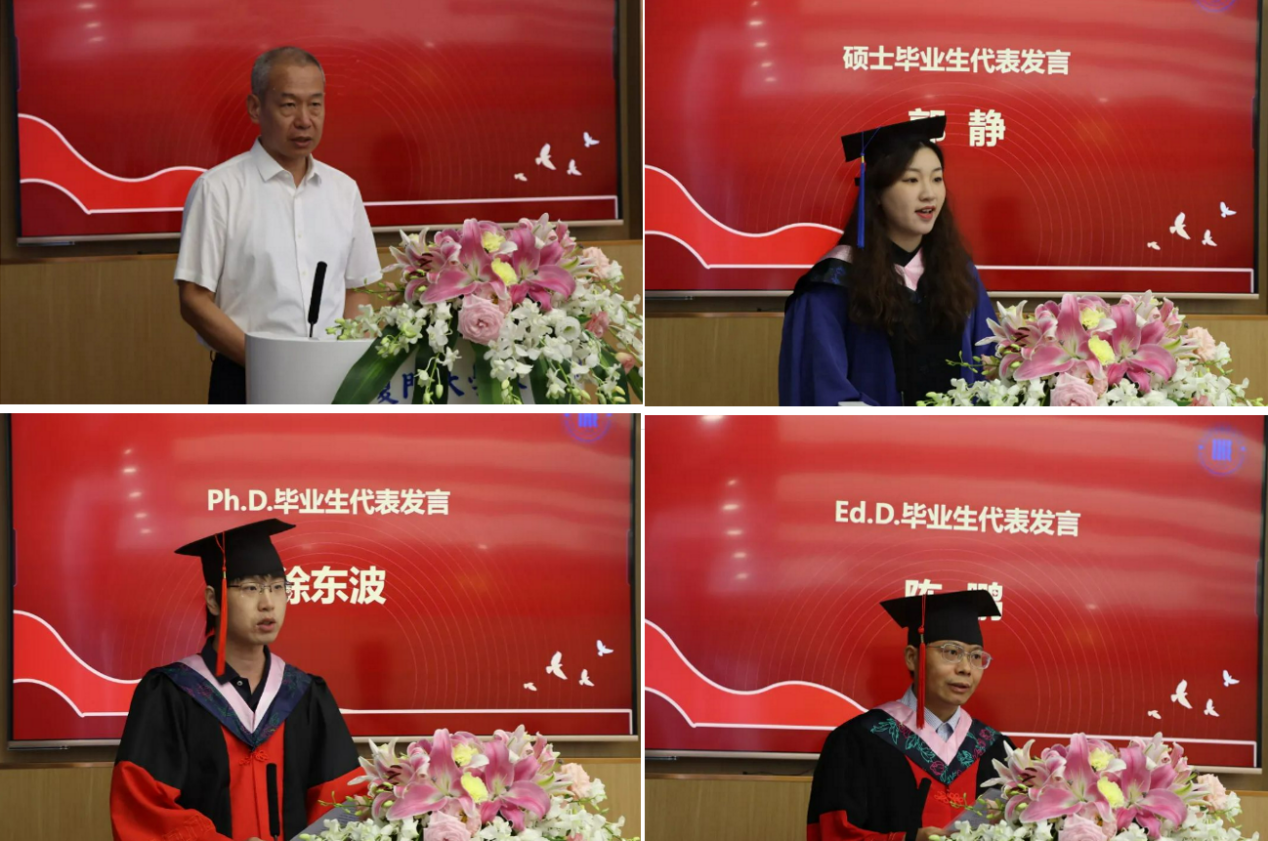 硕士毕业生郭静、教育学博士毕业生徐东波、教育博士毕业生陈鹏等三位毕业生代表在发言中,对教育研究院的悉心培养和老师们的辛勤付出表示衷心感谢,并向全体毕业生们送上了诚挚的祝福。郭静谈到,“教育学教给我们的从来不是用一个模子刻画所有的人。我们追求卓越,也不轻易被定义”。徐东波提到,“博士生活的孤独与压力促进了我们在学术和生活上的成长,也开始渐渐理解潘先生所说的‘板凳甘坐十年冷、文章不写半句空’的真实内涵”。陈鹏表示,“学以成人成己,创以成理成事,未来我们将以高质量的学术研究和工作为教育研究院赢得荣光”。