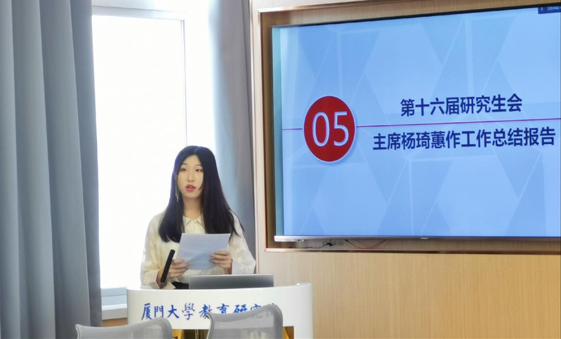 厦门大学研究生会执行主席刘佳桐同学在致辞中,肯定了教育研究院研究生会在学生生活、学术会议、社会实践、校园文化、校院互动、跨院交流等方面所做出的成绩,她希望新一届教育研究院研究生会再接再厉,在继承与创新中永葆生机和活力。