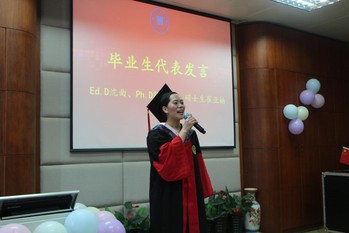 典礼第二项,郑冰冰书记和傅伯奇副书记为我院优秀毕业生颁发了荣誉证书,作为对她们在教研院优异表现的最圆满交代。接着,吴薇老师作为导师代表,上台进行了发言。她对毕业生未来的发展给予了殷切期望,并祝愿毕业生明天的路越走越精彩,明天的前程更加灿烂辉煌。典礼第四项,我院Ed.D博士毕业生沈曲、Ph.D博士毕业生陈春梅和硕士毕业生崔亚楠作为毕业生代表依次上台发言。“宝剑锋从磨砺出,梅花香自苦寒来。”三位杰出的毕业生代表深刻总结了自己在教研院的求学经历,向为她们的成长成才倾注心血和汗水的各位老师表示了诚挚的感谢,并表示,在今后的人生旅途中,将会时刻谨记母校和母院的教诲,带着在厦大校园中耕耘三年的收获奔赴四方,在未来的生活中书写新的华彩篇章。