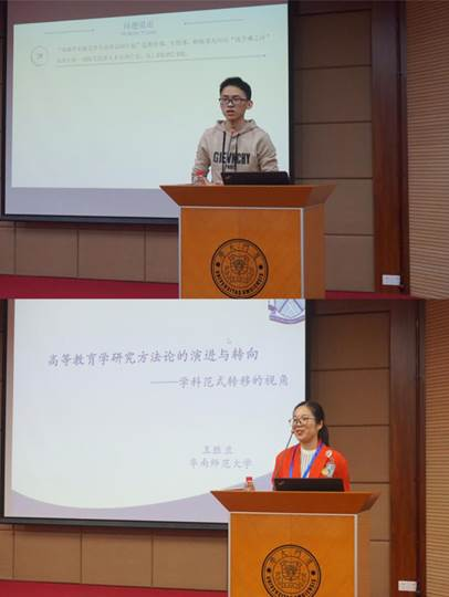 茶歇过后,大会报告由我院研究生会主席杨忠同学主持,华中科技大学吴永源同学和华南师范大学王胜兰同学分别做了《“拔尖计划”学生的学业成就及影响因素的实证研究》和《高等教育学研究方法论的演进与转向——学科范式转移的视角》报告。陈廷柱教授、贾永堂教授、王运来教授、杨亚辉副编审对两位同学的报告进行了精彩的点评,使得在座的同学们受益匪浅。